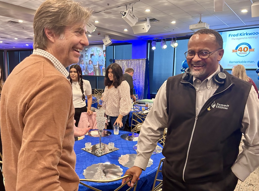 Fred Kirkwood with a well wisher after a Jan. 8 retirement luncheon in his honor. (photo courtesy of Summit Utilities)